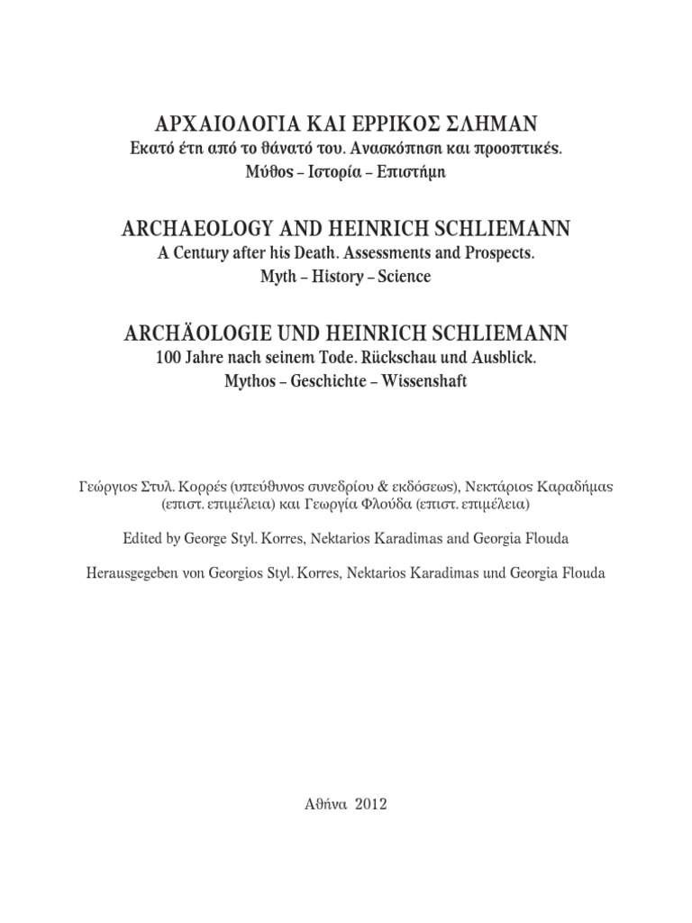 Korres George Karadimas Nektarios And Flouda Georgia Eds 2012 Archaeology And Heinrich Schliemann A Century After His Death Assessments And Prospects Myth History Science Athens Http Goo Gl K6h7ek